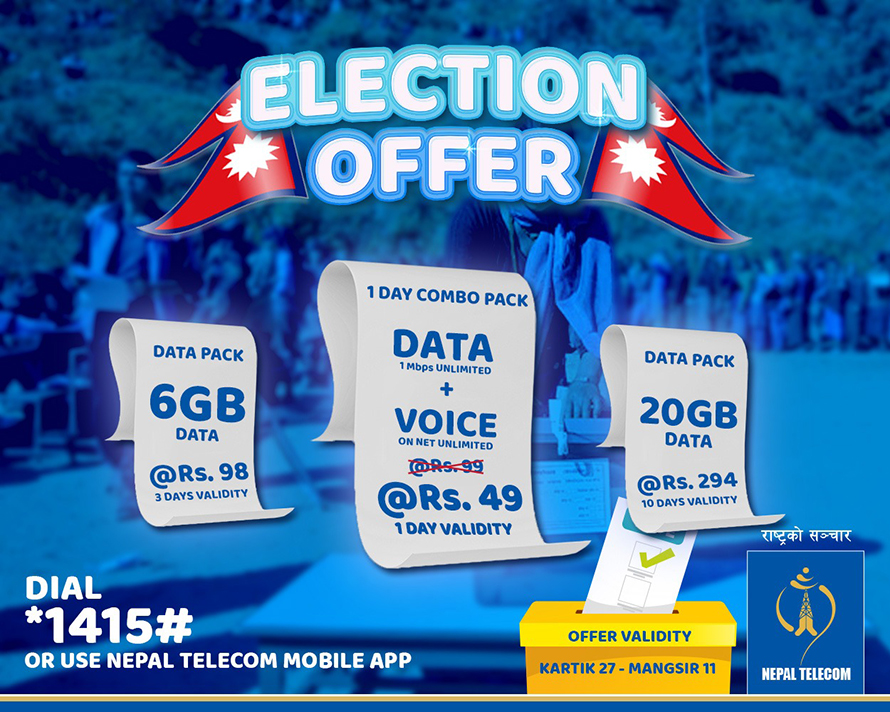 आगामी मंसिर ११ गतेसम्म मोबाइलबाट *१४१५*११# डायल गरी वा ‘नेपाल टेलिकम एप’ प्रयोग गरी सो सुविधा खरिद गर्न सकिन्छ । निर्वाचनको समयमा उपलब्ध हुने यस अफरबाट ग्राहकहरुले उल्लेख्य लाभ प्राप्त गर्ने अपेक्षा कम्पनीले राखेको छ ।