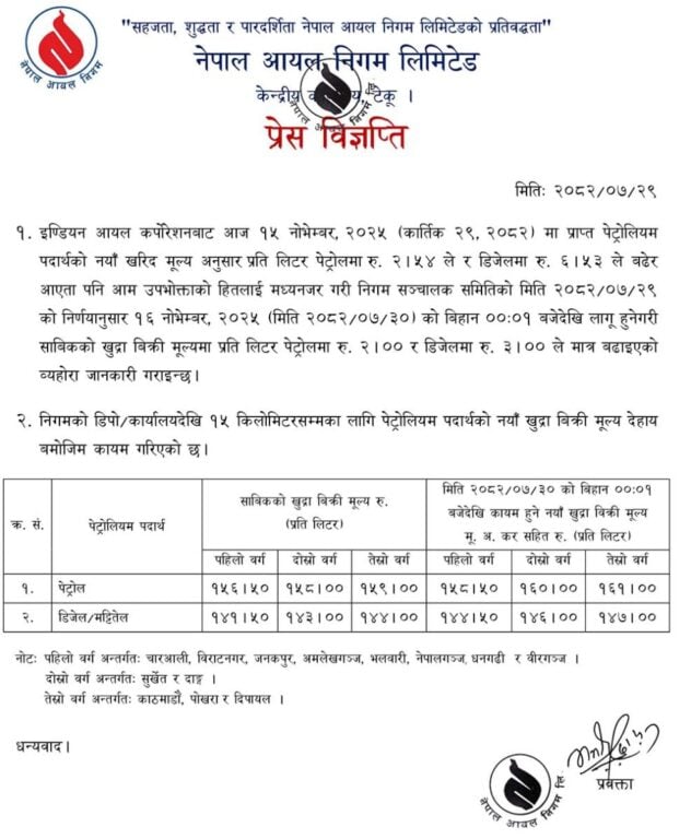 आज आइतबारदेखि लागू हुनेगरी नेपाल आयल निगमले पेट्रोलियम पदार्थको मूल्य वृद्धि गरेको छ । आयल निगमले समायोजन गरेको पेट्रोल, डिजेल र मट्टीतेलको नयाँ मूल्य अनुसार आज आइतबारदेखि पेट्रोल प्रतिलिटर २ रुपैयाँ र डिजेल तथा मट्टीतेल प्रतिलिटर ३ रुपैयाँले बढेको छ । नेपाल आयल निगमका अनुसार भारतबाट पेट्रोलमा २.५४ रुपैयाँ र डिजेलमा ६.५३ रुपैयाँ मूल्य वृद्धि भएर आएको हुँदा त्यस अनुसार आन्तरिक मूल्य बढाइएको हो । मूल्य परिवर्तनपछि काठमाडौं उपत्यकामा पेट्रोल प्रतिलिटर १६१ रुपैयाँ र डिजेल एवं मट्टीतेल प्रतिलिटर १४७ रुपैयाँ पुगेको छ ।